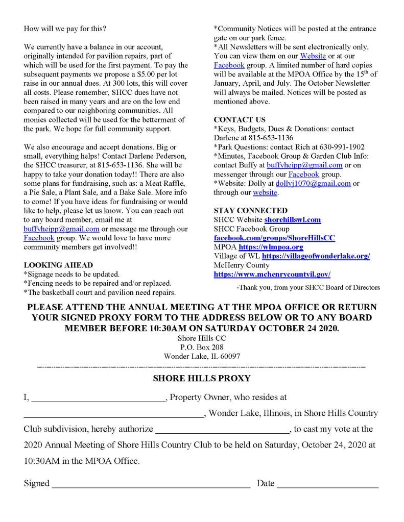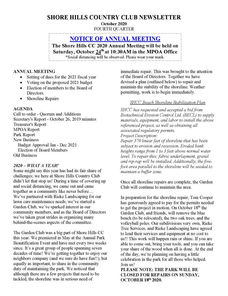 A copy of the fourth quarter Shore Hills Country Club Newsletter, (October 2020), has been mailed to all of our members’ homes. Some of the topics addressed are: the successes of the Garden Club, the Shoreline Stabilization Plan, raising the annual dues, possible donations and fundraising, future park repairs, election of the Board of Director’s members, and the proposed 2021 budget.