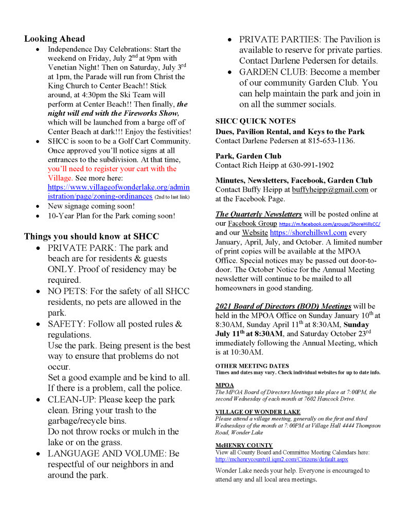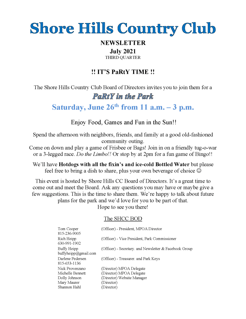 View the interactive version of the Shore Hills Country Club newsletter on Facebook or below. Some of the topics addressed include: the PARTY IN THE PARK (June 26, 2021), Independence Day celebrations, Shore Hills CC becoming a Golf Cart Community, new park signage, the 10 year plan for the park, and much more!