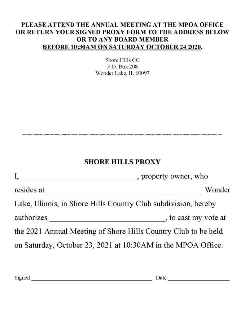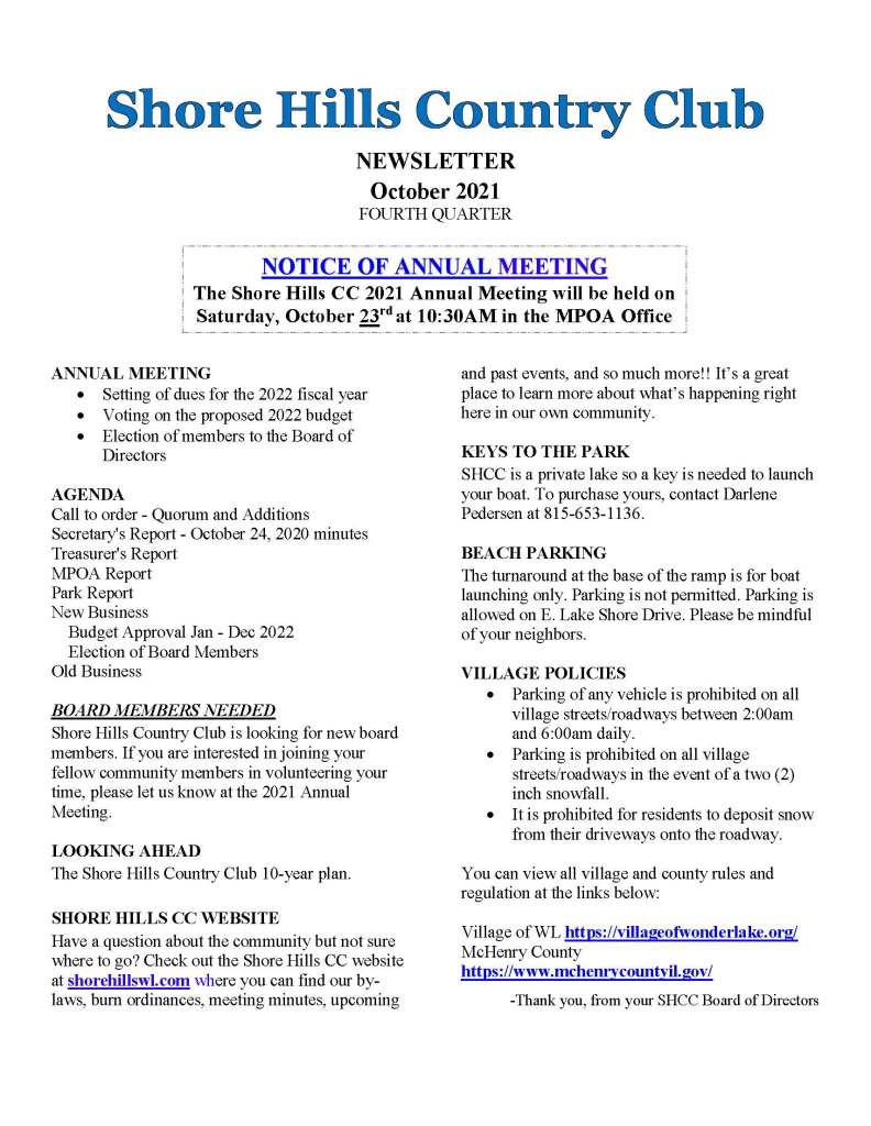 A copy of the fourth quarter Shore Hills Country Club Newsletter, (October 2021), has been mailed to all of our members’ homes. Some of the topics addressed are: date, place, and time for the Annual Meeting, (October 23, 2021, MPOA office, 10:30 a.m.), the Annual Meeting agenda, the search for new board members, and a review of pertinent village policies.
