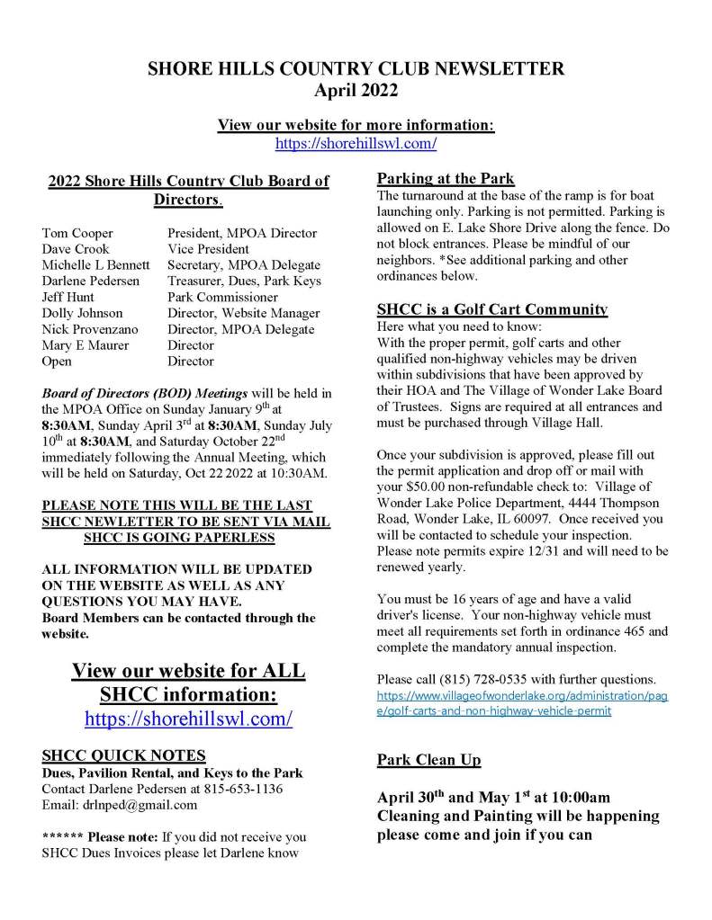 A copy of the current Shore Hills Country Club Newsletter dated April 2022, has been mailed to all of our members’ homes. NOTE: This will be the final newsletter mailed to our members’ homes. In the future, all News Information will be found on this website.