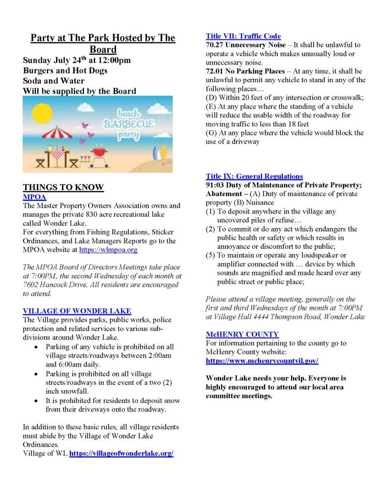 Some of the topics discussed in the newsletter are: Park Beautification on April 30th and May 1st; BOD meeting info; Park Parking; Party at the Park info; MPOA info; SHCC info as a Golf Cart Community; as well as miscellaneous info concerning Village and traffic regulations. A copy of the newsletter follows: